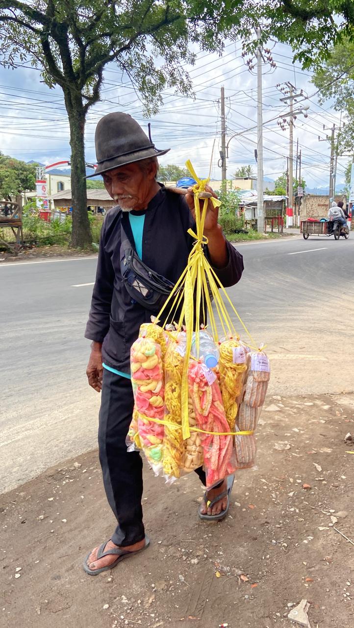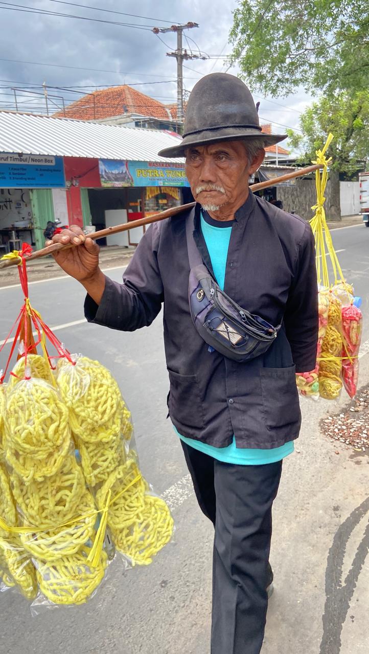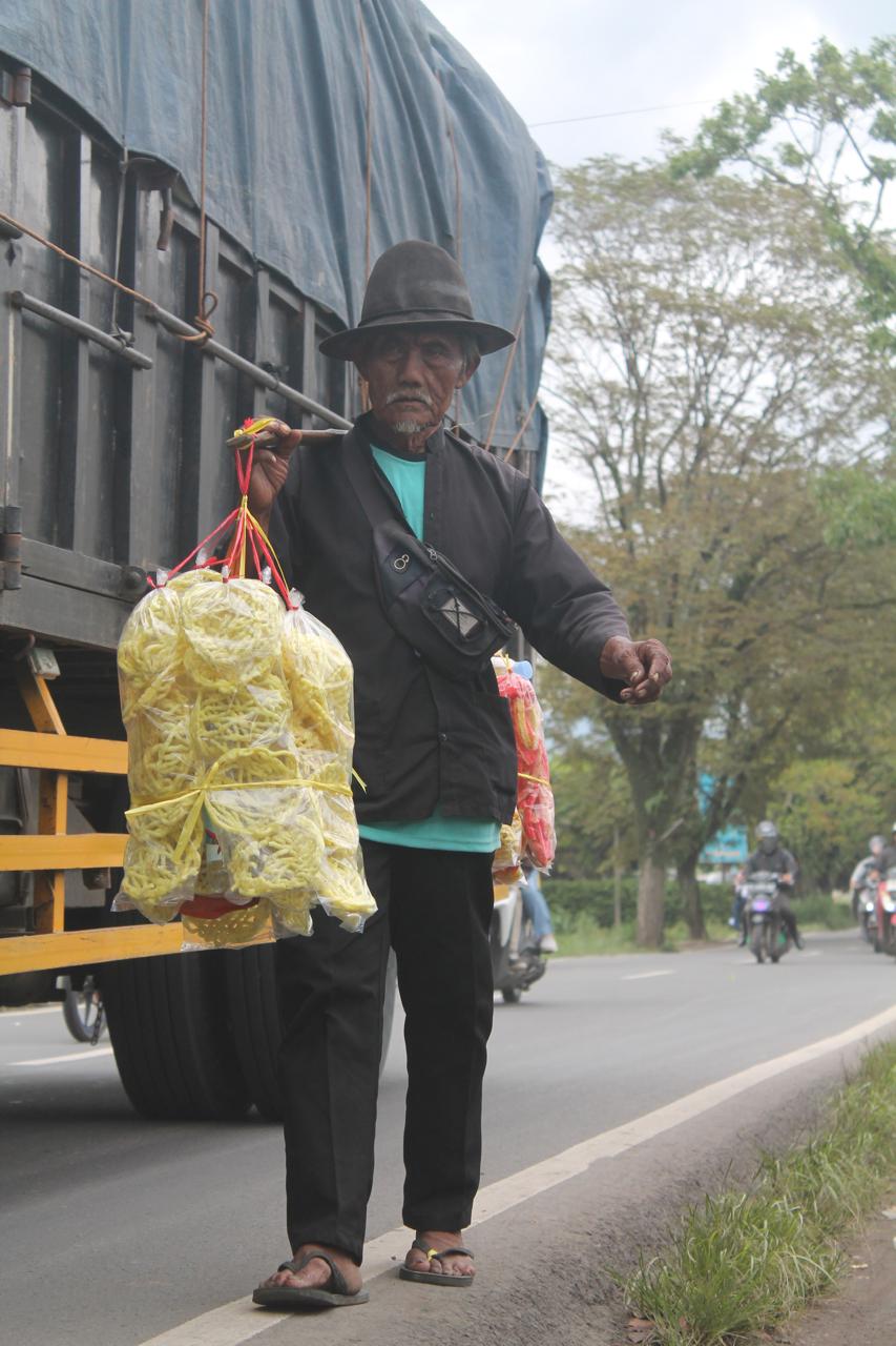 berisi kerupuk, sementara tongkat kecil di tangannya menjadi penopang setia bagi tubuhnya yang mulai rapuh dimakan usia.