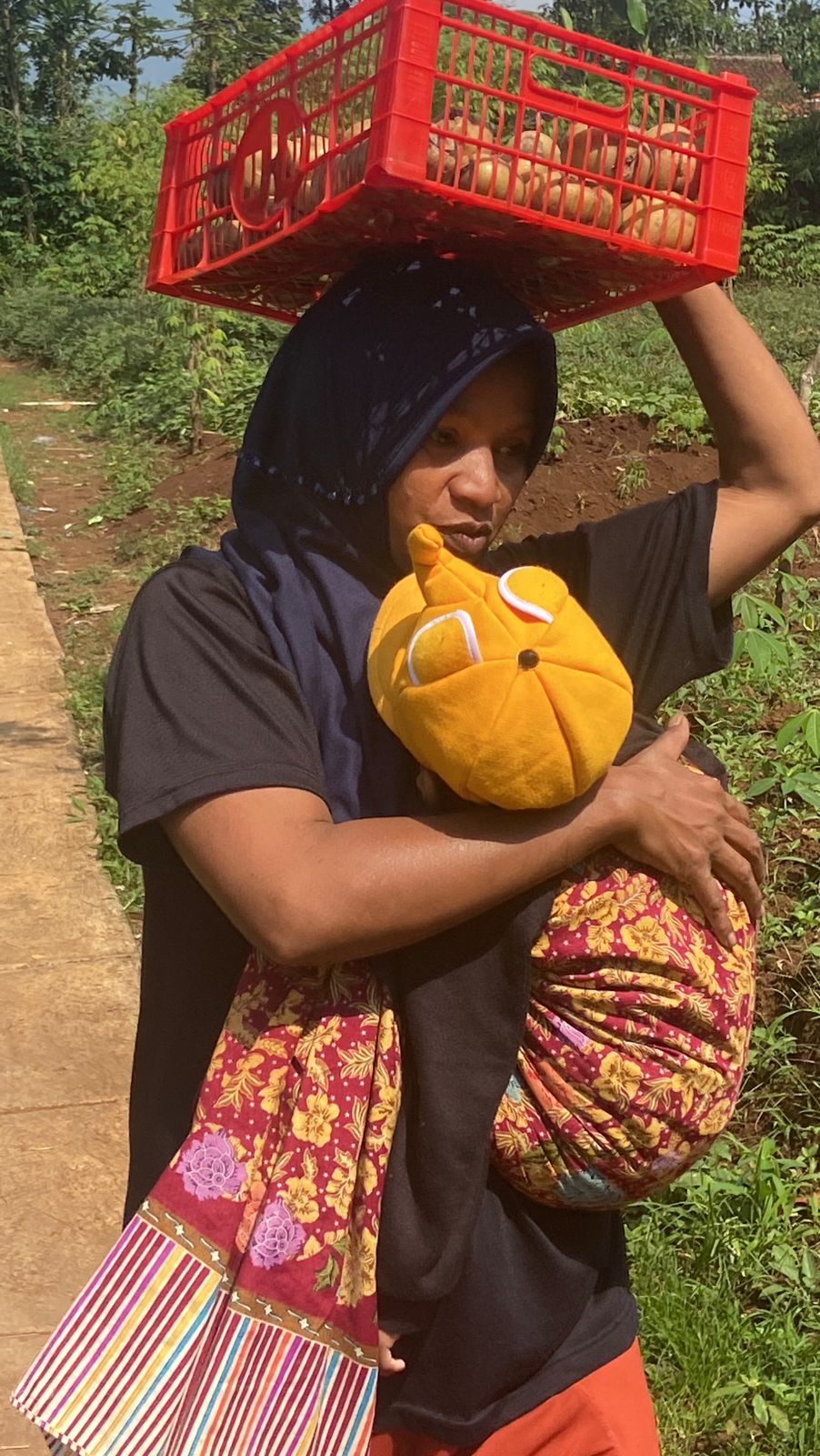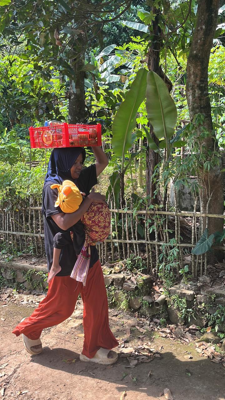Ditengah panas terik, seorang wanita paruh berjalan dengan mengendong seorang anak, tangan kanan memegang sang anak, tangan kiri memegang keranjang berisi buah yang ia simpan diatas kepalanya.