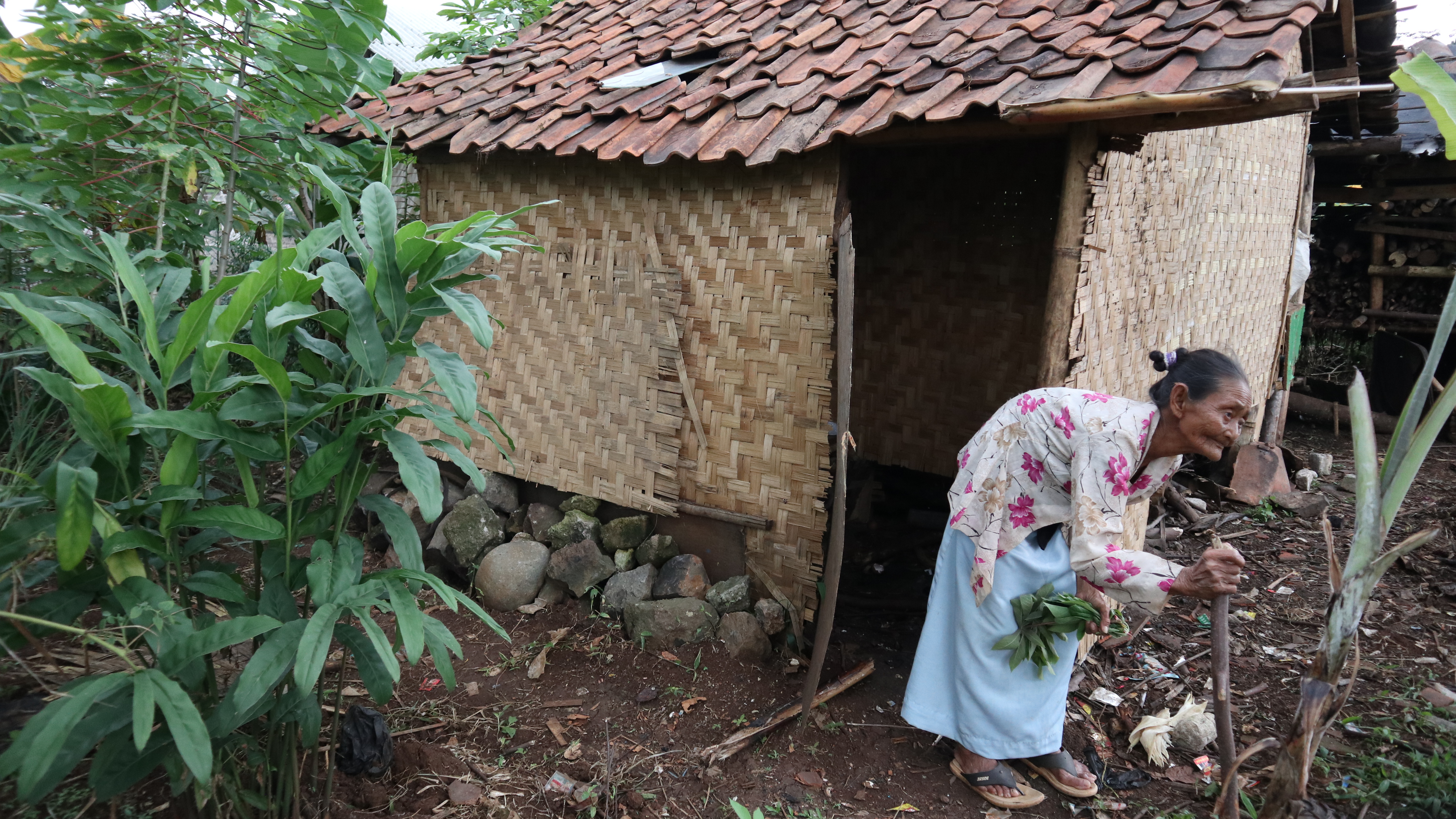 Setiap hari Mak Atikah (83) meringkuk kedinginan di atas lantai kayu gubuk tuanya. Kain tipis yang digunakan untuk selimut hanya ampuh untuk menangkal gigitan nyamuk. Apalagi saat hujan turun, kondisi gubuk sangat mengkhawatirkan. Banyak air masuk lewat sela-sela genteng dan dinding bambu yang sudah bolong.