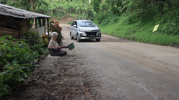 Di pinggiran jalan rusak tampak seorang lansia memegang sebuah ember bekas seraya meminta sedikit rezeki kepada mereka yang berlalu lalang menggunakan kendaraan melalui jalan itu.