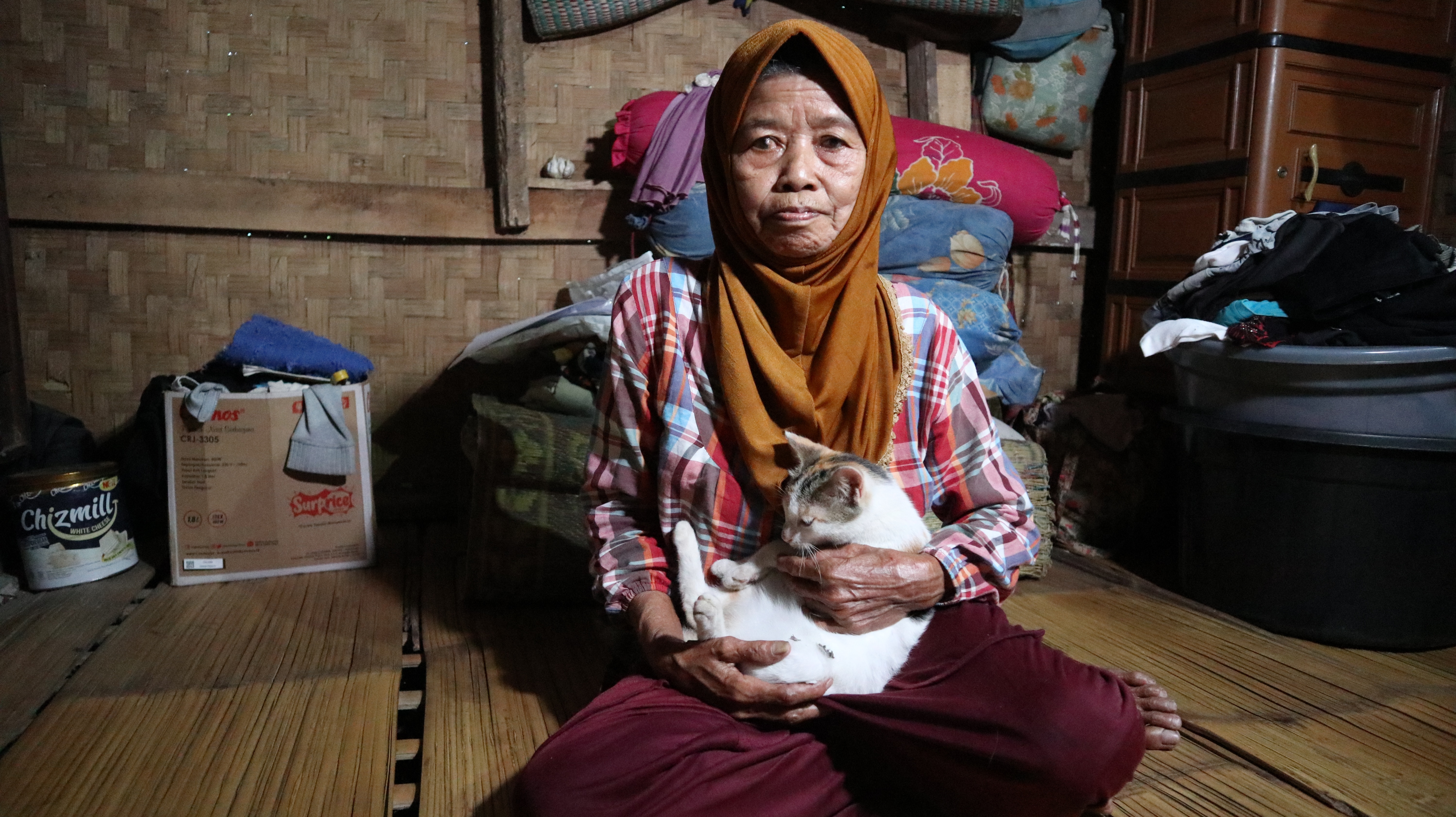 Di bawah atap gubuk tua yang lapuk dan keropos, Mak Raswati (59) tinggal bersama kucingnya. Suaminya telah meninggal dunia 13 tahun lalu, dan kini Mak Raswati hidup sebatang kara dengan kondisi matanya katarak.