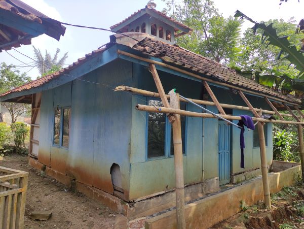 Masjid sudah rusak sejak tahun 2015. Kayu penyangga sudah keropos dimakan rayap. Genteng sudah usang, berlumut, bahkan ada pecah. Dinding bagian kanan sudah bergeser dan hampir jatuh. Jadi kami berinisiatif menopangnya dengan bambu.
