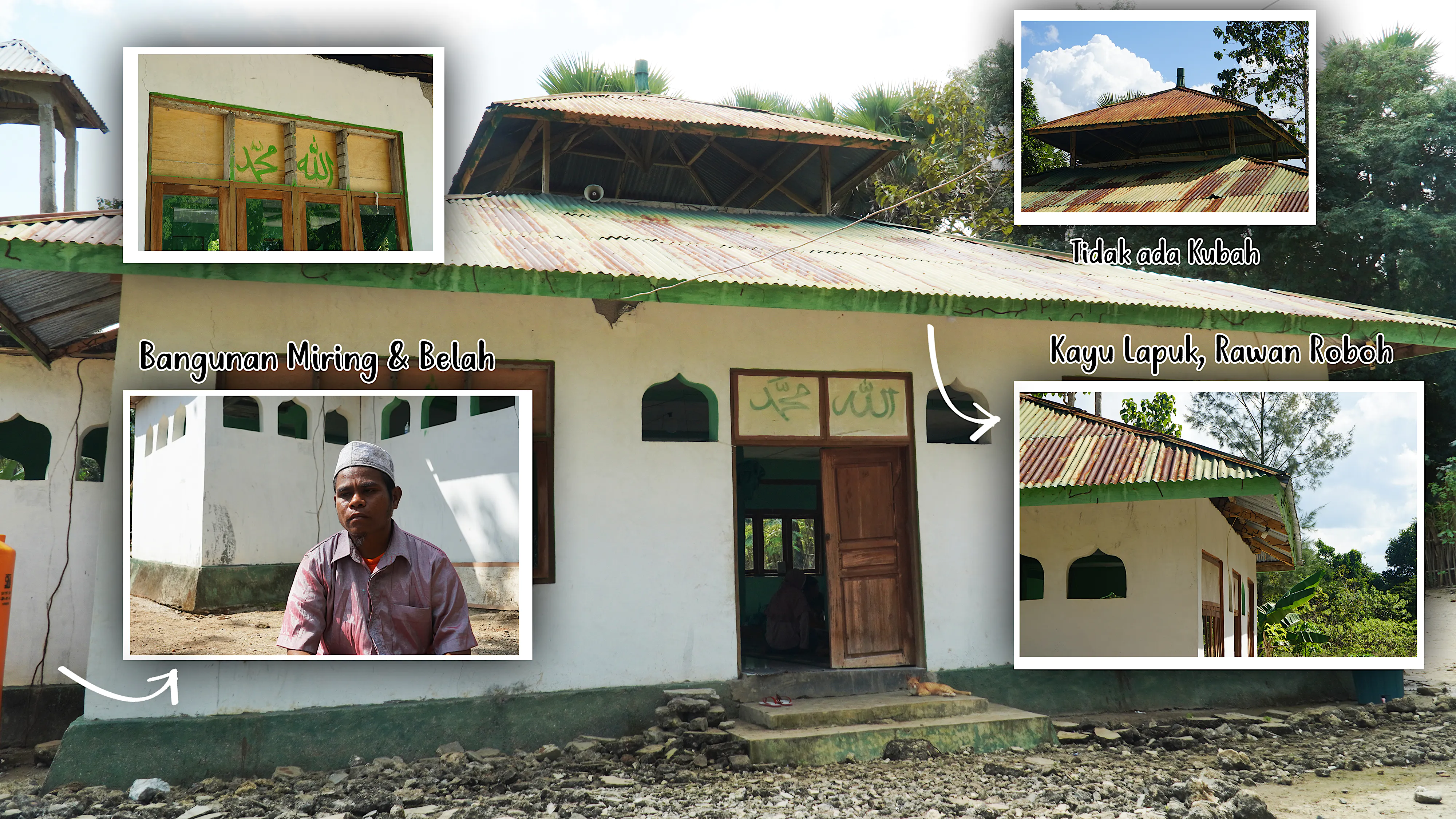 Pojok mimbar tidak ditutupi plafon, sehingga sajadah Imam sering basah kena cipratan air hujan. Diikuti dengan rayap yang menggerogoti kusen dan kaca pecah yang diganti dengan triplek tipis,dinding-dinding masjid dan pondasi yang sudah terbelah retak dan warga patungan membangun tiang pondasi agar dapat menopang atap masjid tidak ambruk.