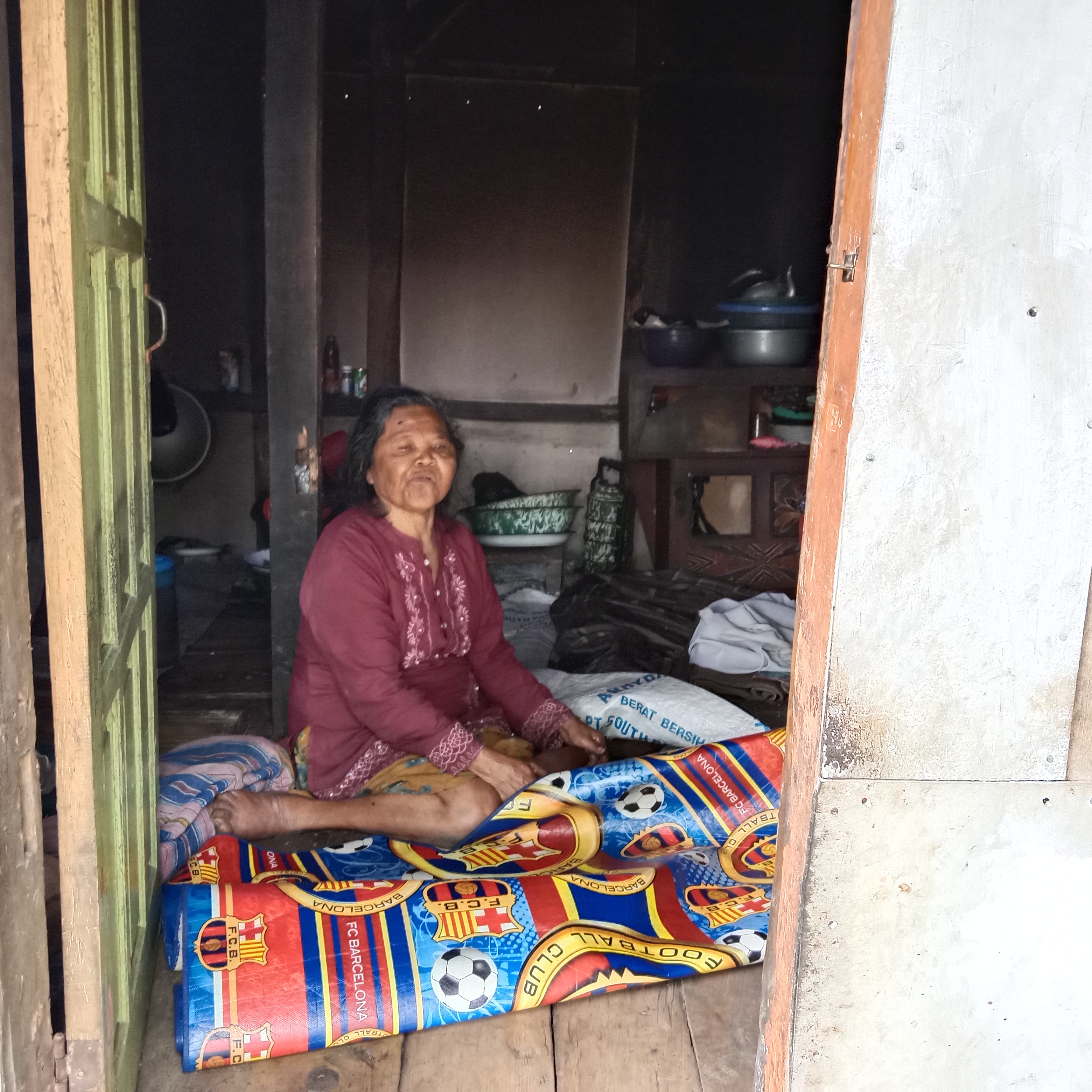 “Seumur hidup saya ga pernah ke mana-mana. Dulu saya diurus orang tua, sekarang tinggal adik yang masih ada. Kadang-kadang dia kirim beras, itupun kalo ada, kasian hidupnya juga susah karena cuma buruh tani.”