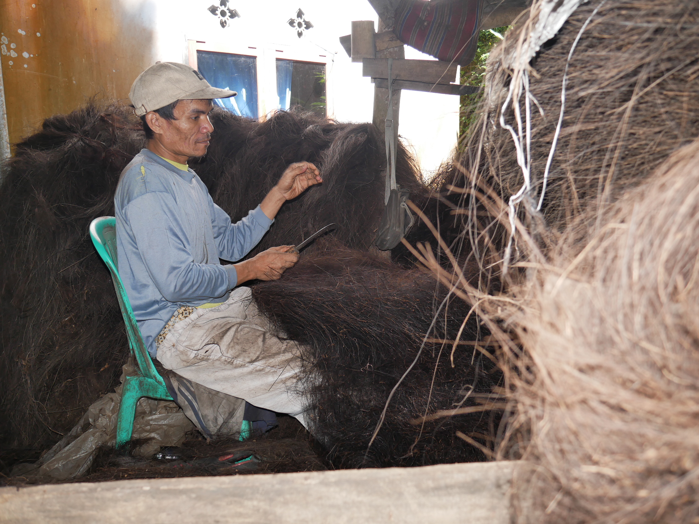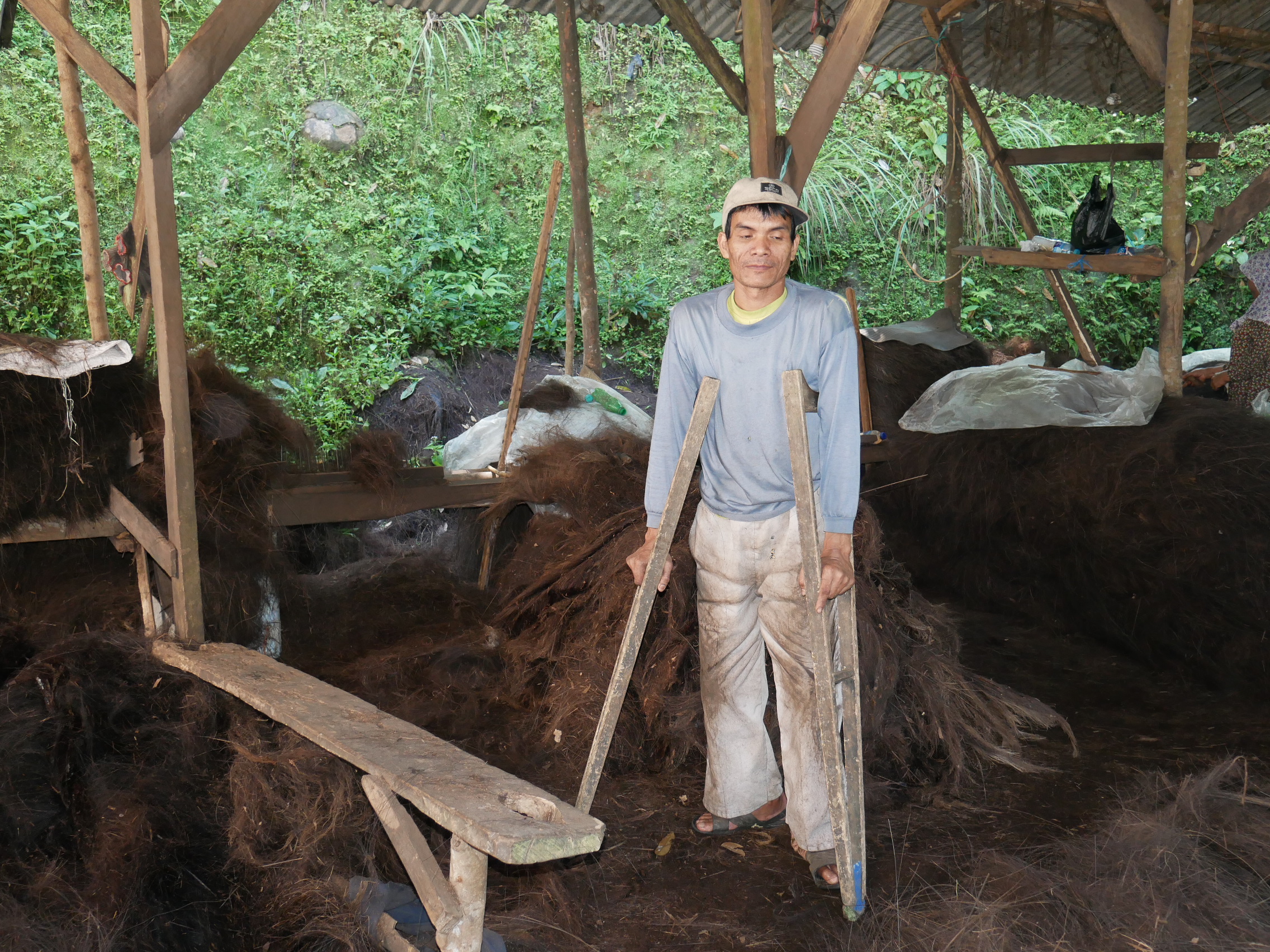 Pak Dayu bekerja sebagai buruh di pengolahan serabut ijuk dengan penghasilan hanya 30 ribu per hari, dari jam 7 pagi sampai 5 sore.