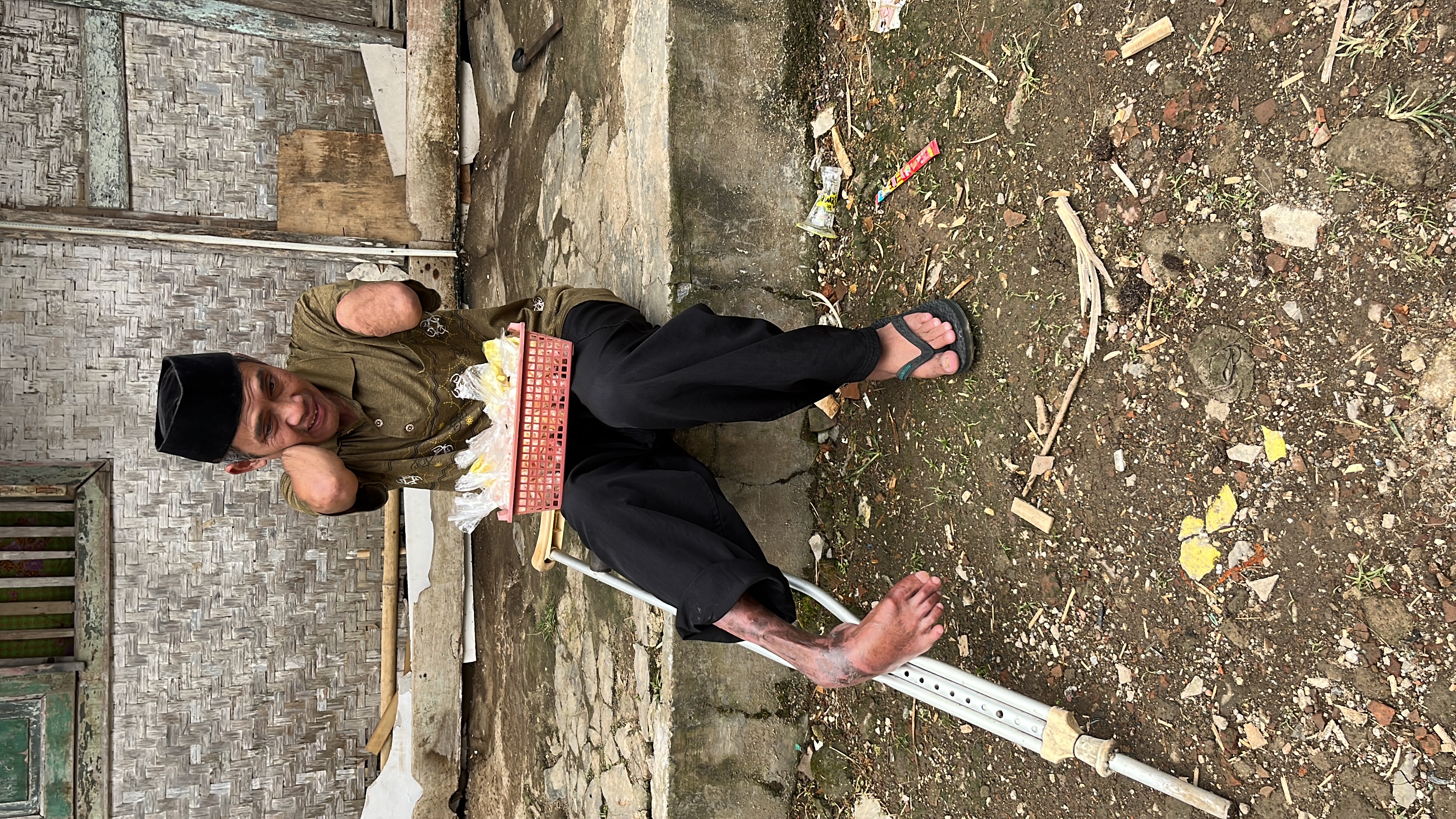 Untuk bertahan hidup, Pak Dede jualan makanan ringan keliling kampung menggunakan sebelah kakinya. Penghasilan yang didapat hanya 10 – 20 ribu per hari. Pak Dede berharap punya warung atau modal usaha lain agar bisa terus produktif di tengah keterbatasannya saat ini.