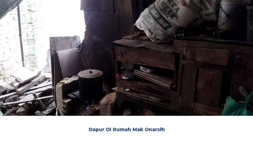Suami mak Onarsih sudah meninggal saat umur 67 tahun dikarenakan sakit paru-paru, penyakit suaminya mak Onarsih semakin parah karena sering kedinginan pada waktu malam hari. Terlebih saat musim hujan tiba, "Rumah itu kaya kolam kalau hujan, apa lagi waktu bapak sedang sakit, gak bisa istirahat, semakin parah penyakitnya karena sering kedinginan setiap malam, sebab atap rumahnya pada bocor dan sebagian sudah ambruk" ujar Mak Onarsih sambil terisak isak menahan tangis.