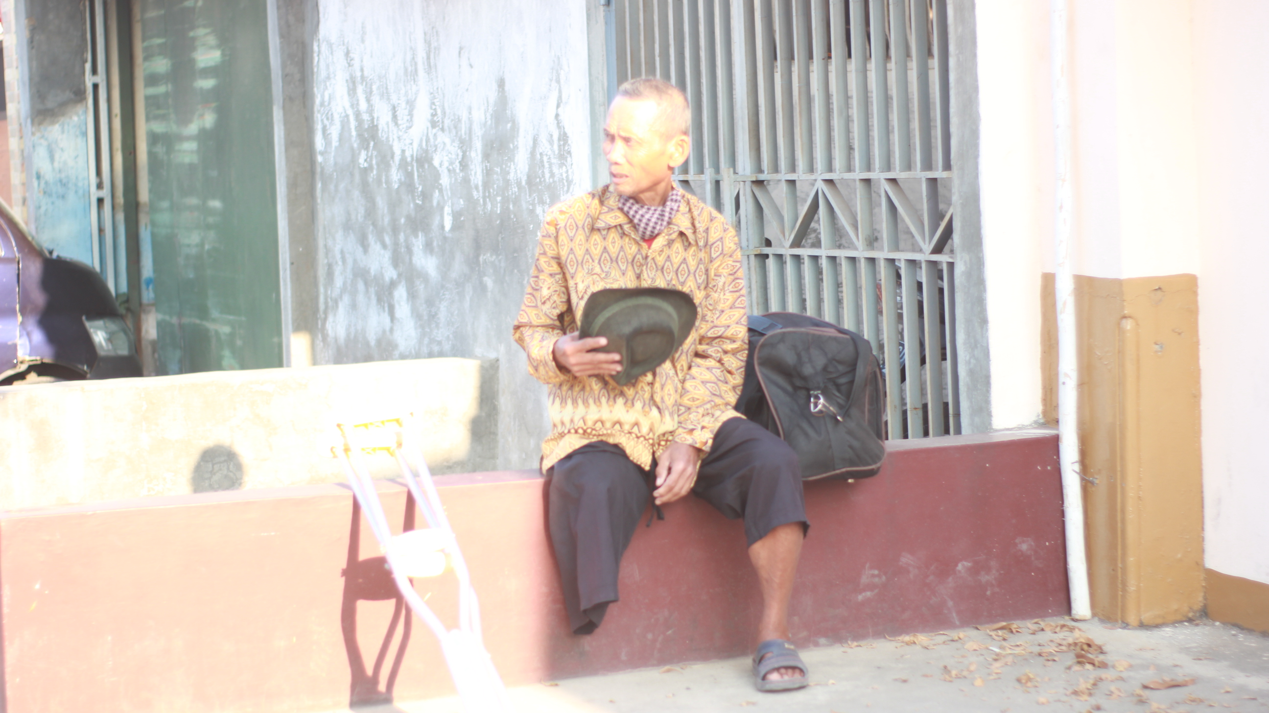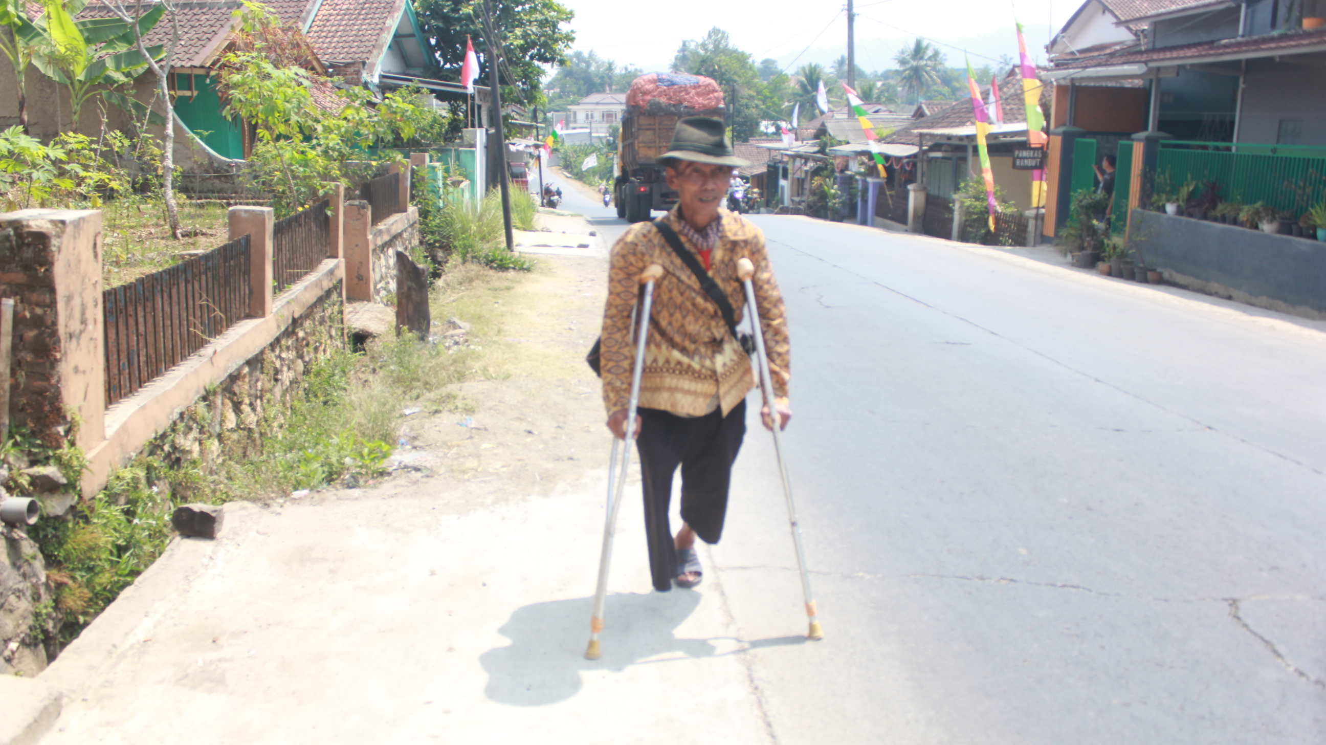 Seorang laki-laki lanjut usia tampak berjalan perlahan, sesekali ia berhenti dan menawarkan barang dagangan yang ia bawa. Terlihat jelas ia kesulitan menapaki jalan raya dengan kedua tongkat yang menopang tubuhnya. Kaki kanannya yang tampak sudah tak ada lagi menjadi kendala baginya untuk berjalan secara normal, namun raut wajahnya masih saja sering menampakan senyuman seolah ia tak merasakan letih.