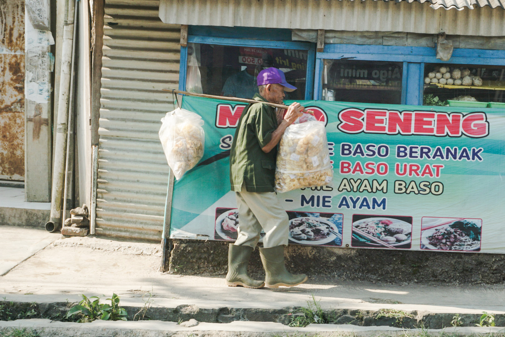 Saya bertemu dengan Abah Aman, seorang penjual kerupuk kulit berusia 81 tahun, yang duduk melamun di bawah terik matahari karena dagangannya sepi pembeli.