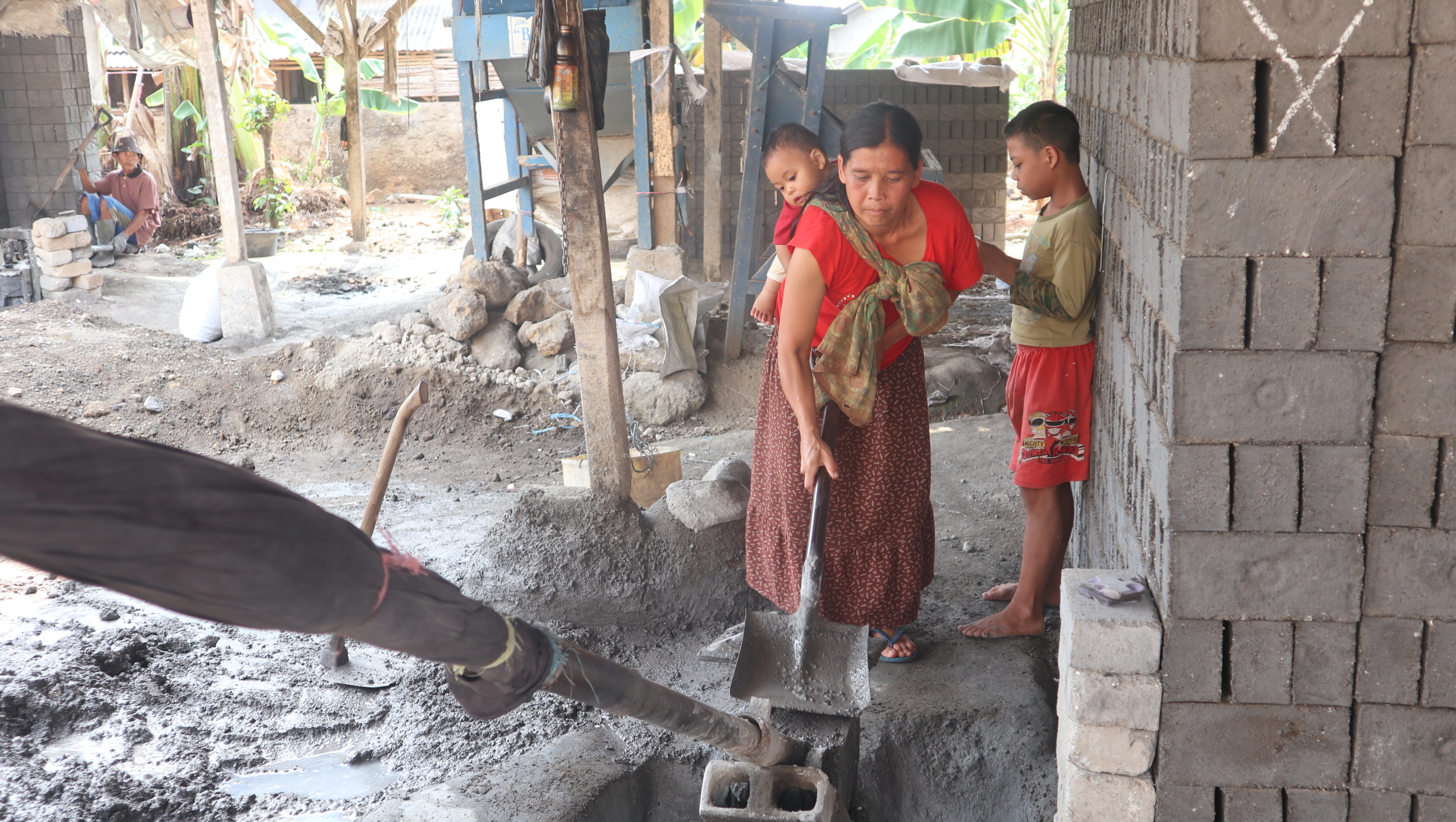 Saat ini ibu Imas tengah bekerja di pabrik pembuatan batako milik tetangganya. Ia tampak bekerja seraya membawa kedua anaknya. Anaknya yang paling kecil ia gendong di belakang punggungnya. Tangannya memegang sekop untuk memasukan adukan bahan pembuat batako. Meskipun lambat ia tetap mengerjakannya dengan hati-hati agar hasilnya tidak mengecewakan.