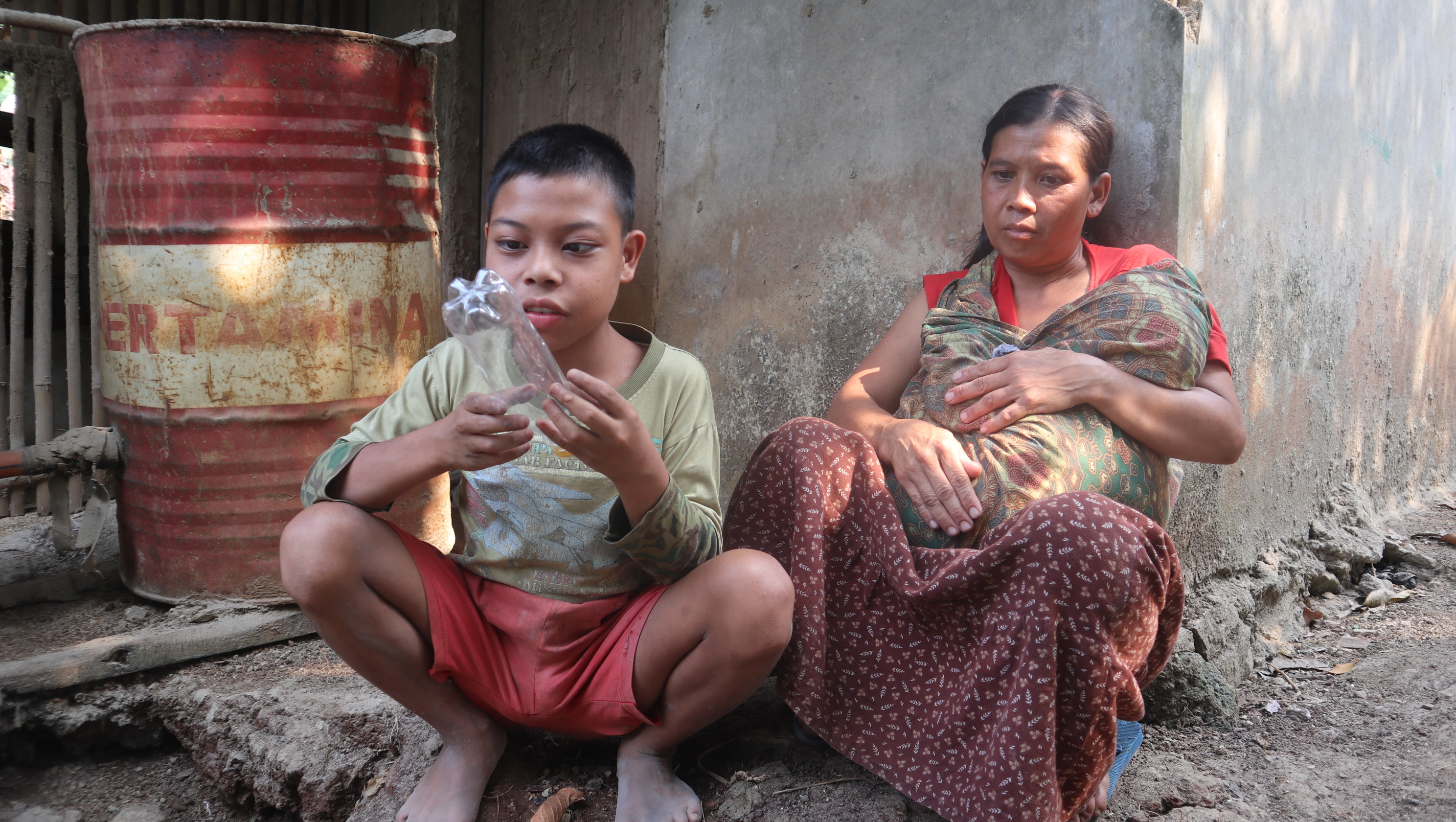 Tentu saja penghasilan sebagai buruh serabutan tidaklah besar dan tak menentu. Ia harus menahan rasa sakit dan lelah untuk bekerja. Ditambah lagi ia tak bisa meninggalkan kedua anaknya yang memiliki kondisi istimewa. Ia harus bekerja dengan membawa kedua anaknya itu. Itulah yang terkadang juga memberikan kesulitan lebih baginya.