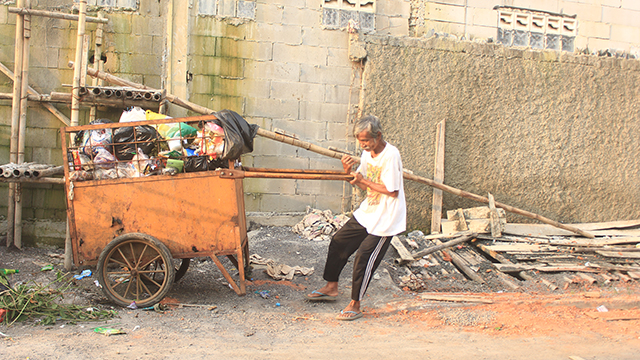 Di bawah teriknya matahari, setiap tetesan keringat menjadi saksi perjuangannya. Kaki gemetar menopang beban sampah yang terkumpul menjadi jejak usaha Pak Tisna untuk keluarga.