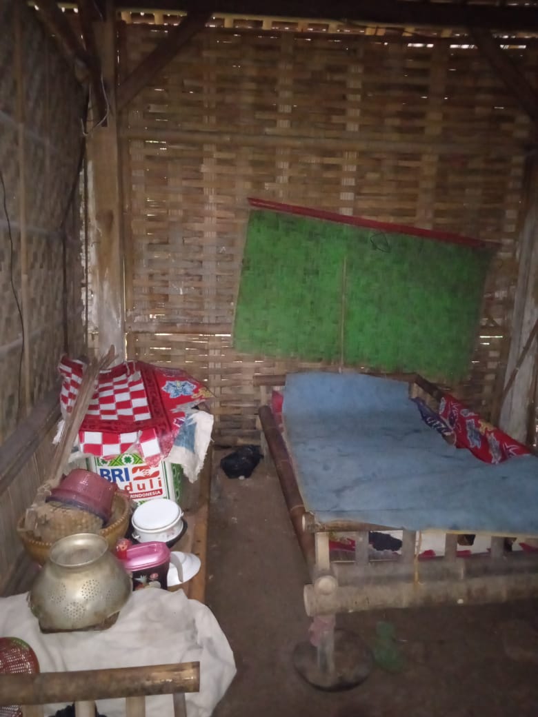 Belum lagi atap gubuk yang selalu bocor. Air hujan selalu merembes masuk dan membasahi dalam gubuk.