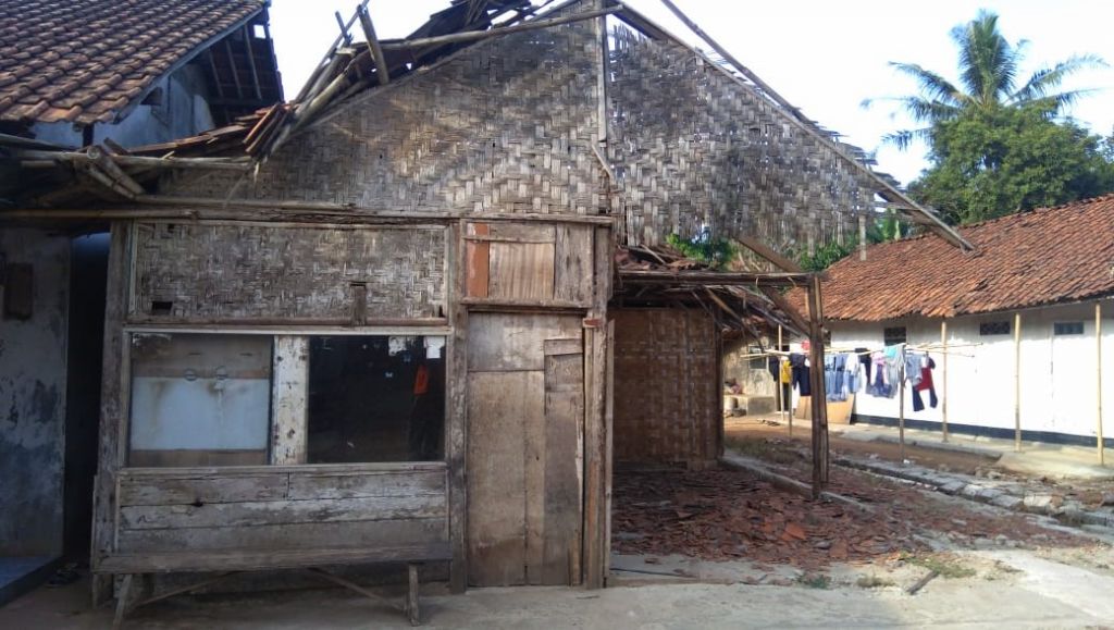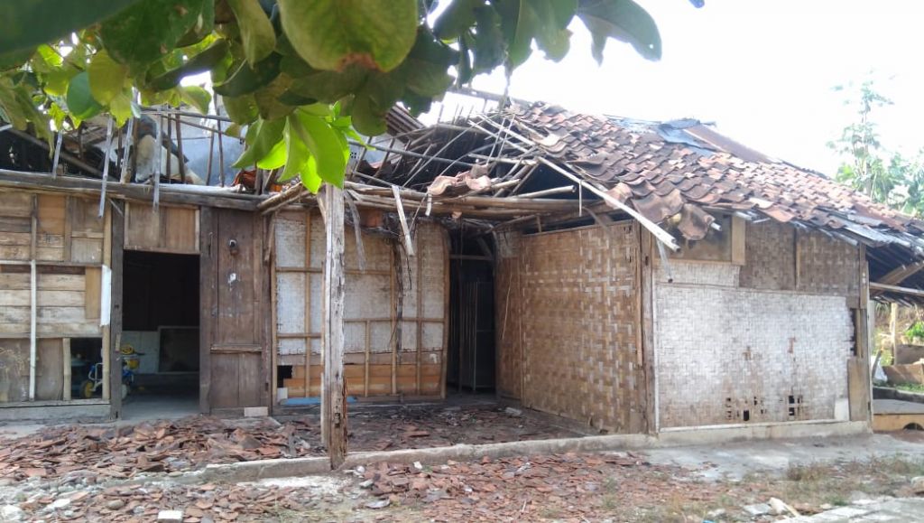 Lihat beberapa genteng yang sudah mulai berjatuhan, kayu penahan gentengnya juga sudah lapuk, bahkan bilik bambunya banyak yang berlubang.