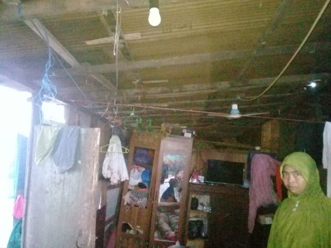 Kondisi rumahnya sangat memperihatinkan, bekas puing-puing dapur yang ambruk masih jelas terlihat. Bahkan lemari beliau terlihat miring, dinding rumahnya menggunakan kalsibot, lantai beralaskan kayu seadanya.