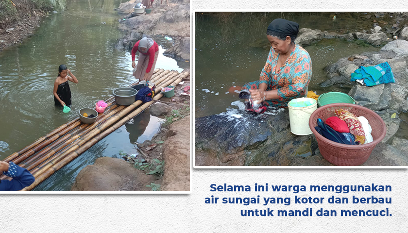 Sebuah kampung yang dihuni oleh 100 KK ini terpaksa harus mandi dan cuci di sebuah sungai yang kotor dan berbau yang jaraknya 3 km dari tempat tinggal mereka.