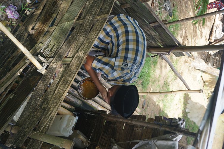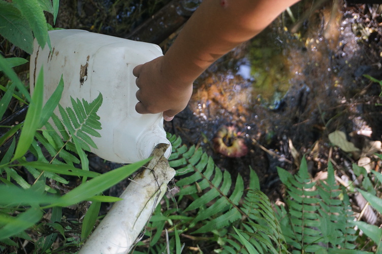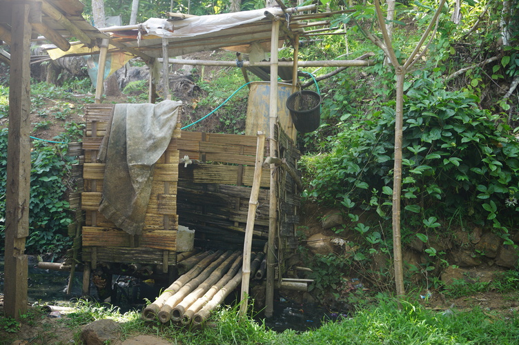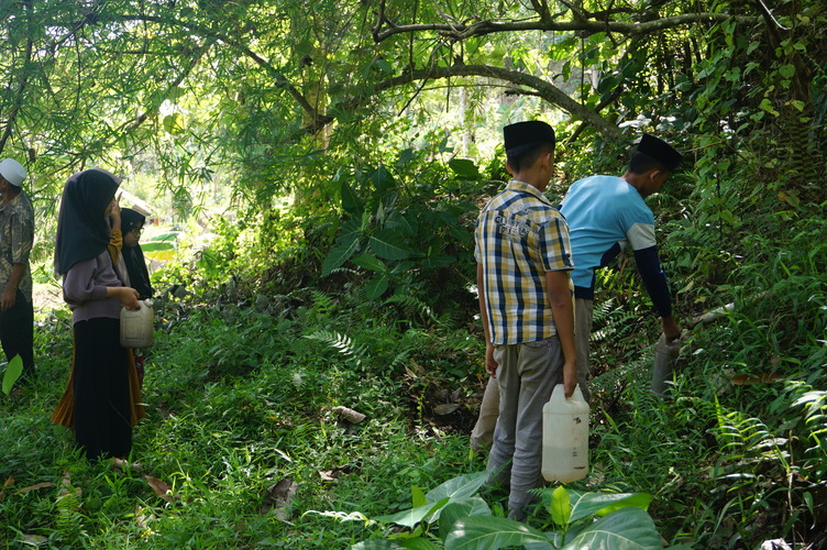 “Anak-anak biasanya bawa kompan (jerigen air) dari rumah buat wudhu atau keperluan lainnya kalau mata air disini lagi kering, kalau ada biasanya mereka juga harus nampung dulu pake kompan di mata air. Wudhu sama buang air ya Cuma disitu. Belum ada uangnya buat bangun tempat wudhu sama toilet.” Ustadz Idas kembali memaparkan kondisi di Madrasah Manarul Huda.