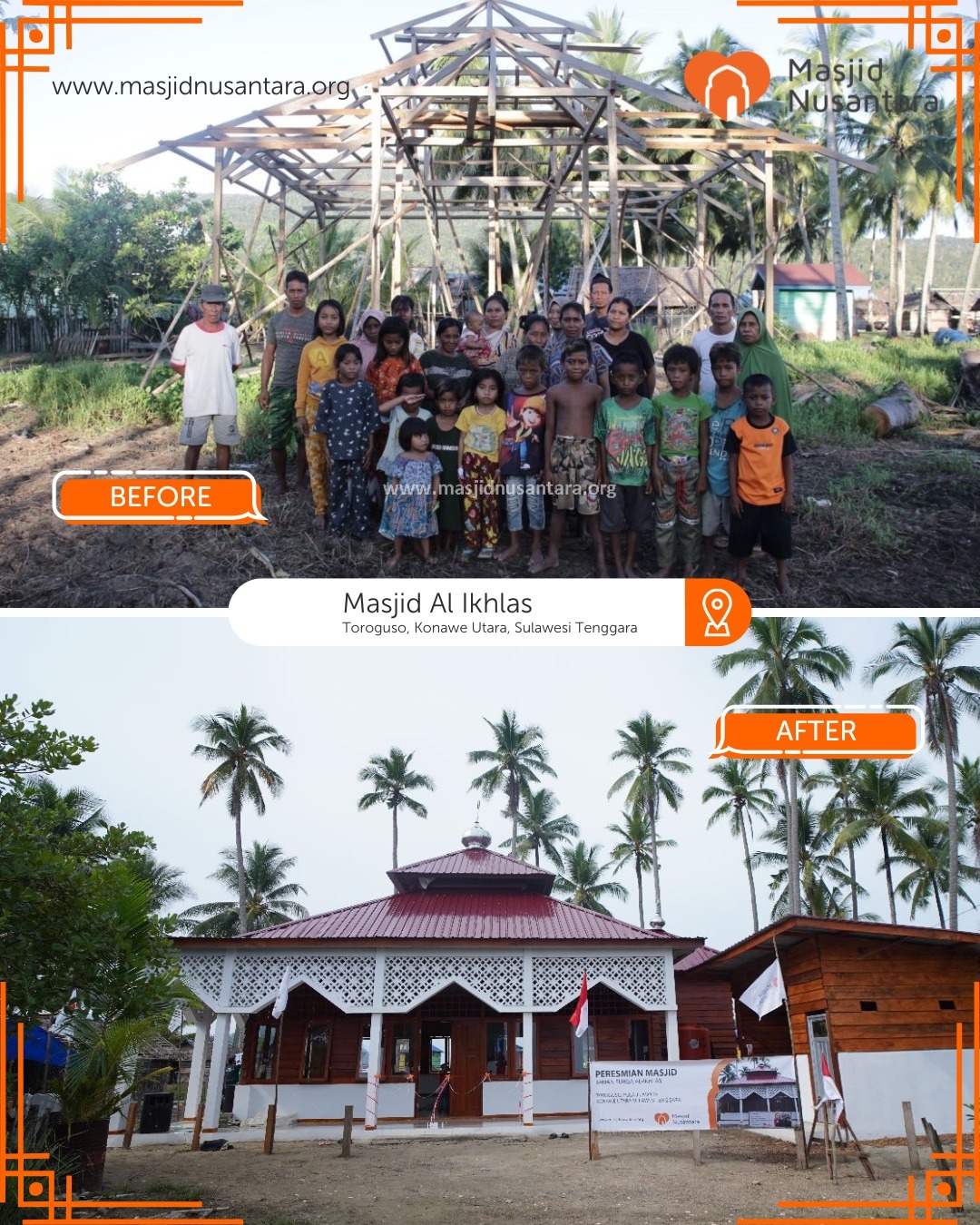 Salahsatunya di Konawe Utara, Sulawesi Tenggara. Sedih, masjid di sana masih berupa kerangka, namanya Masjid Al Ikhlas. Warga tak mampu menghadirkan bahan material yang layak. Wajar saja, untuk sampai ke sana harus menggunakan perahu. Alhamdulillah berkat Sobat Ghoib semua, Warga Konawe akhirnya memiliki masjid yang layak.