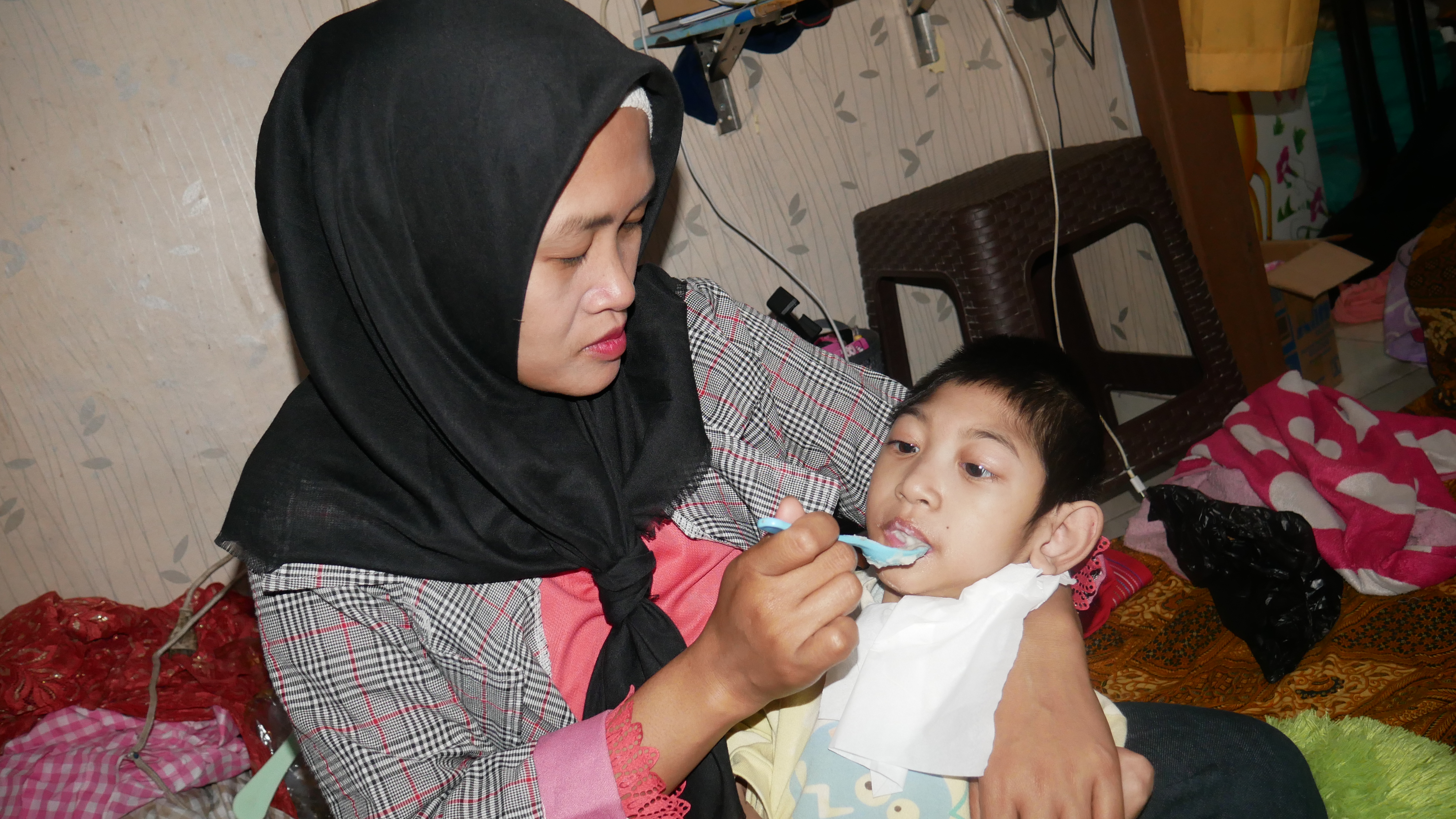 Setiap hari Bu Dewi dengan sabar memandikan, menyuapi, menggantikan baju atau popoknya bahkan memberihkan kotoranya, semua itu beliau lakukan dengan penuh rasa kasih sayang dan tanggung jawab. Besar sekali harapan Pak Endang dan Bu Dewi untuk kesembuhan anak sulungnya ini