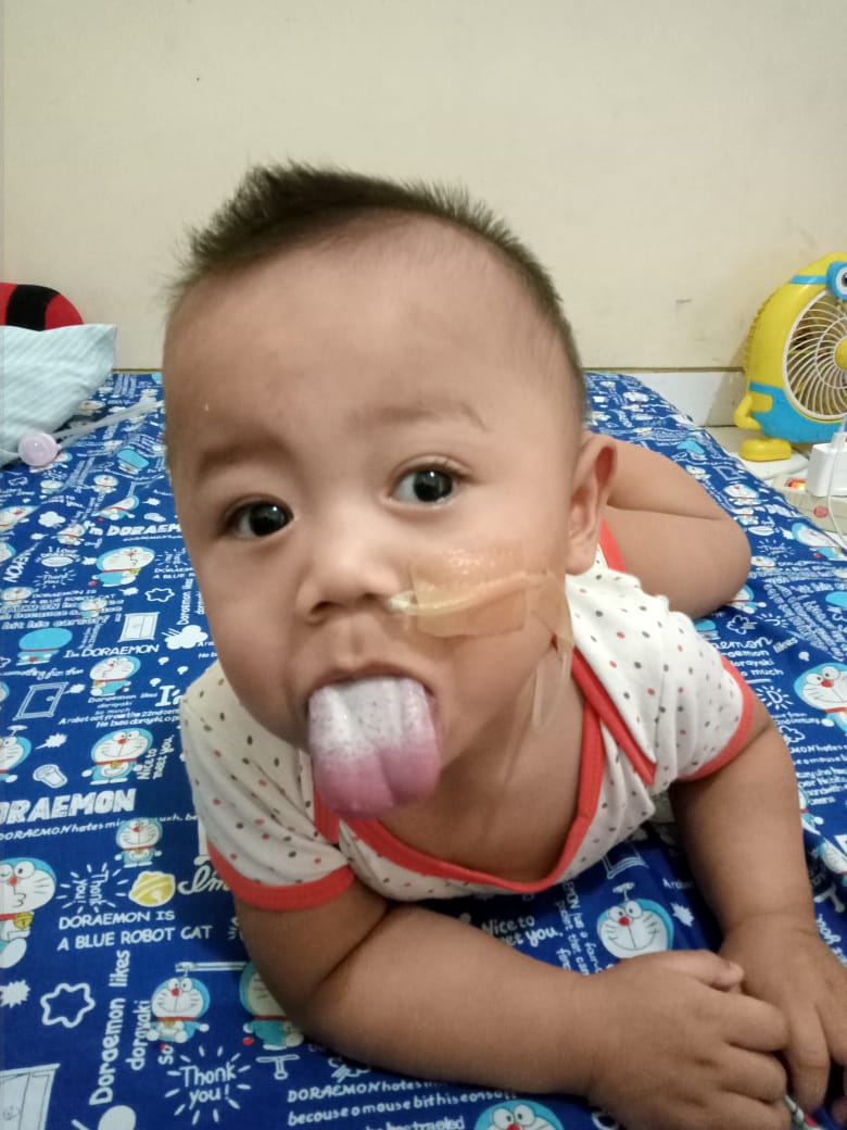 Namanya Ilham Tri Putra saat ini usianya 1,9 tahun, ia menderita penyakit Syndrome langka sejak lahir dan membuatnya sulit menelan makanan, karena lidahnya tak bisa tertutup.