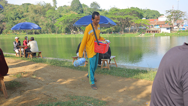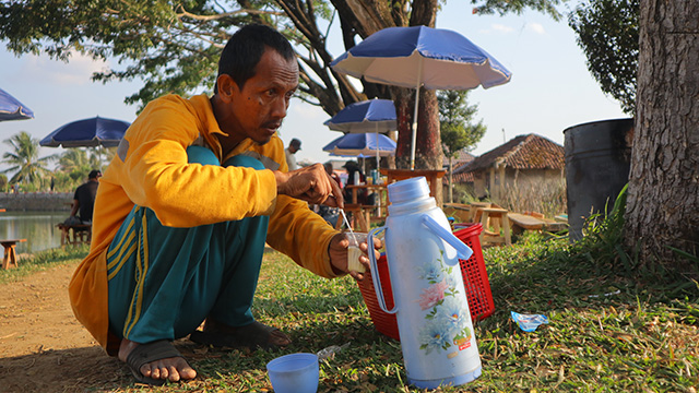 Nampak ada pemandangan lain di lalu lalang tempat wisata itu. Seorang laki-laki dengan gemetar mengangkat termos air untuk menyeduh kopi di tangannya.