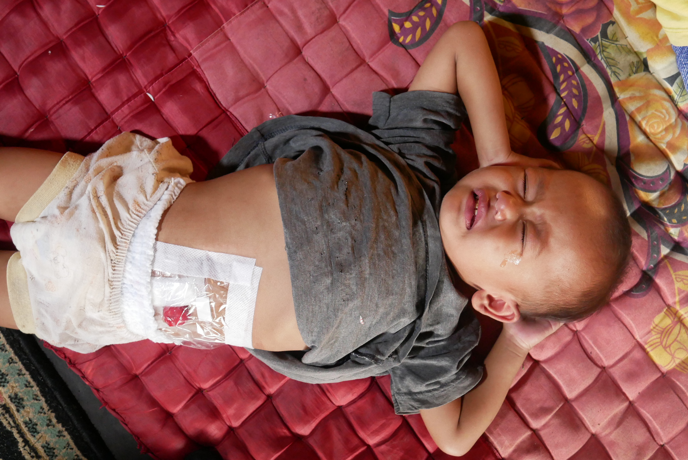 Saluran tersebut hanya ditutup plastik biasa yang direkatkan. Untuk membeli plastik medis khusus harganya 45 ribu rupiah, cukup mahal untuk orang tua Rahmat. Plastik penutup harus diganti setiap saat, jika tidak maka usus Rahmat akan mengalami infeksi.