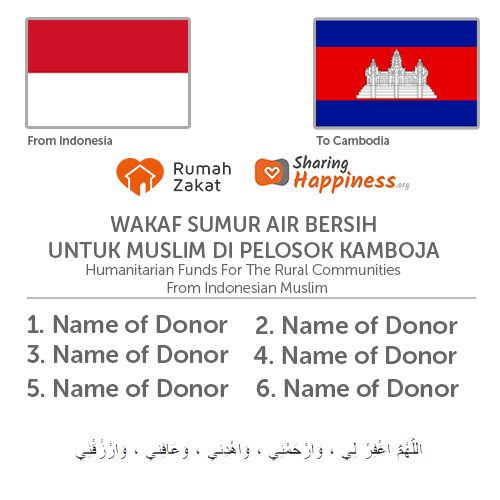 1. Donasi yang terkumpul akan disalurkan untuk Pembangunan sumur air atau pembangunan sarana air bersih di Kamboja dan ditempat lainnya yang membutuhkan.