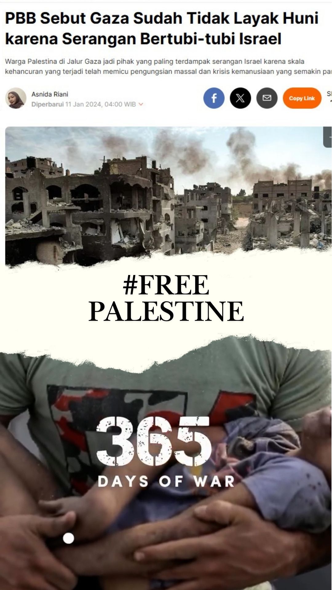 Menurut PBB, tanah Palestina telah dinyatakan TIDAK LAYAK HUNI akibat serangan bertubi-tubi dari pasukan Isra*l. Infrastruktur yang hancur, tempat tinggal yang luluh lantak, serta minimnya akses terhadap kebutuhan dasar membuat kehidupan di wilayah tersebut semakin tak mungkin dijalani dengan layak. Kini, kemanakah penduduk Palestina yang menjadi korban perang harus pergi dan berlindung? Apalagi saat ini mereka menghadapi musim dingin tanpa persiapan. Tanpa tempat perlindungan yang layak, pemanas, atau pakaian hangat, mereka harus menghadapi dingin yang ekstrem dalam kondisi yang sangat memprihatinkan.