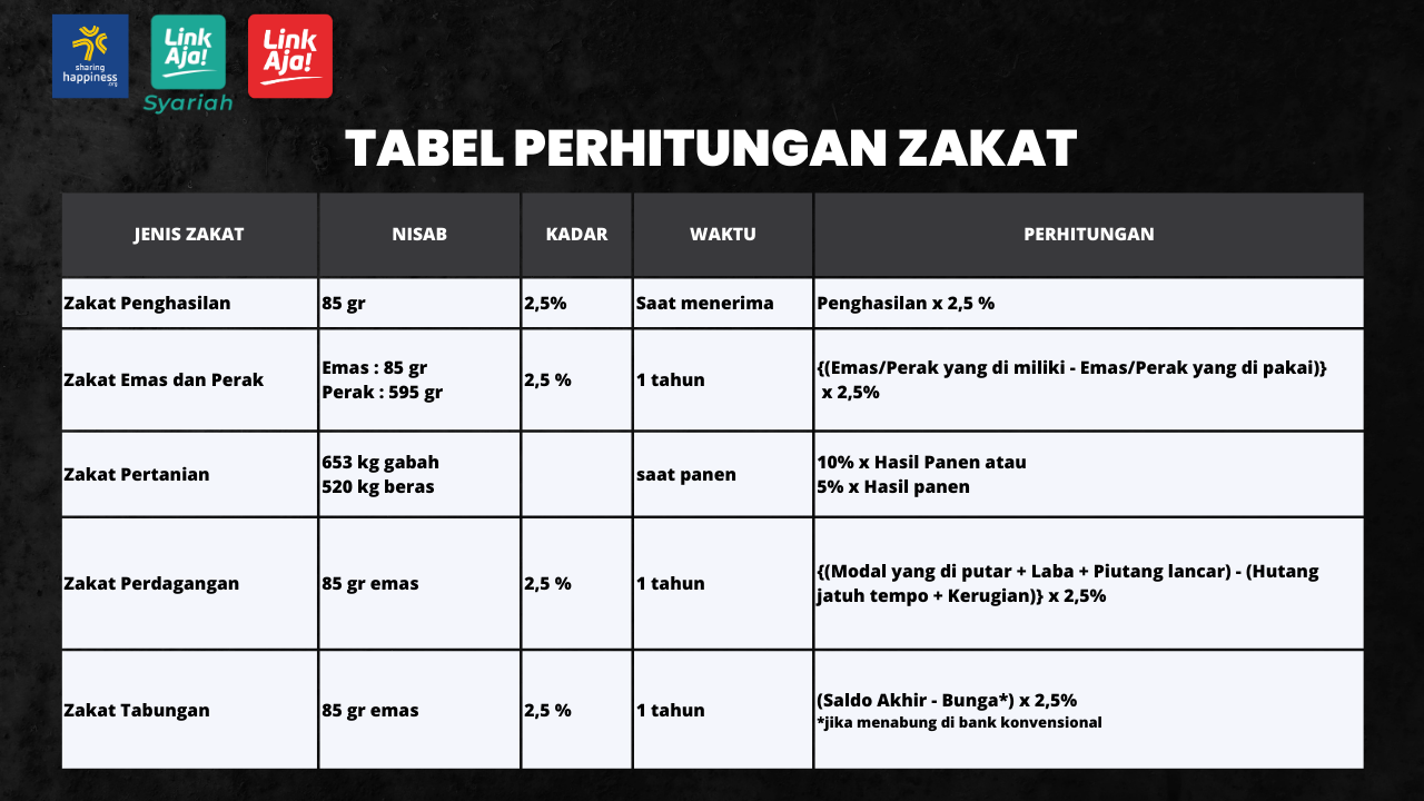 - Besar zakat yang dikeluarkan = (Pendapatan total – Pengeluaran perbulan*) x 2,5%